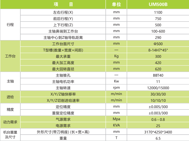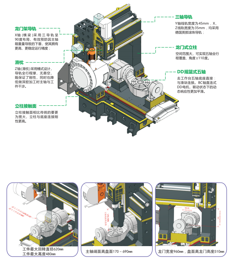 UM500B五軸加工中心 轉(zhuǎn)臺直驅(qū)電機(jī) 帶有刀尖跟隨 搖籃BC結(jié)構(gòu) 龍門架結(jié)構(gòu) ±110°全行程加工范圍